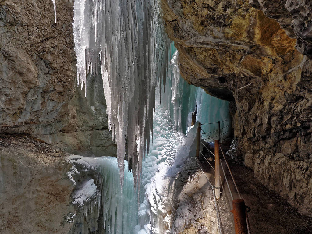 Dieses magische Erlebnis ist nur jetzt im Winter möglich! Denn das Sickerwasser, das im Sommer an den Felswänden herabtropft, erstarrt bei Frost zu gewaltigen, meterlangen Eiszapfen. Diese hängen wie schwere kristallene Kronleuchter von den Klippen herab und formen eine Art „Eiskathedrale“. Durch diese könnt ihr auf schmalen, in den Fels gehauenen Pfaden wandert.